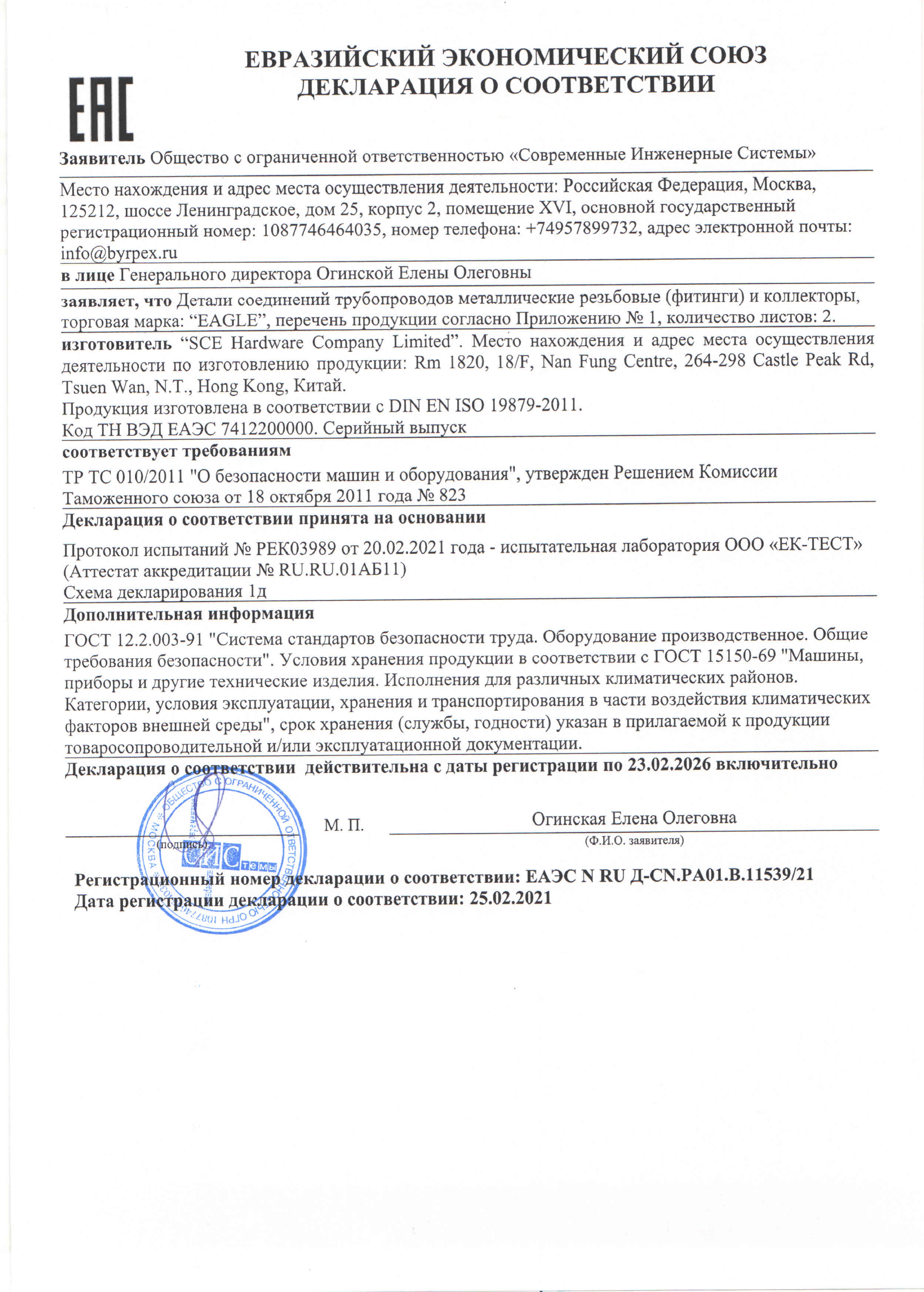 Соединения резьбовые и коллекторы EAGLE - BYR PEX. Декларация о соответствии.